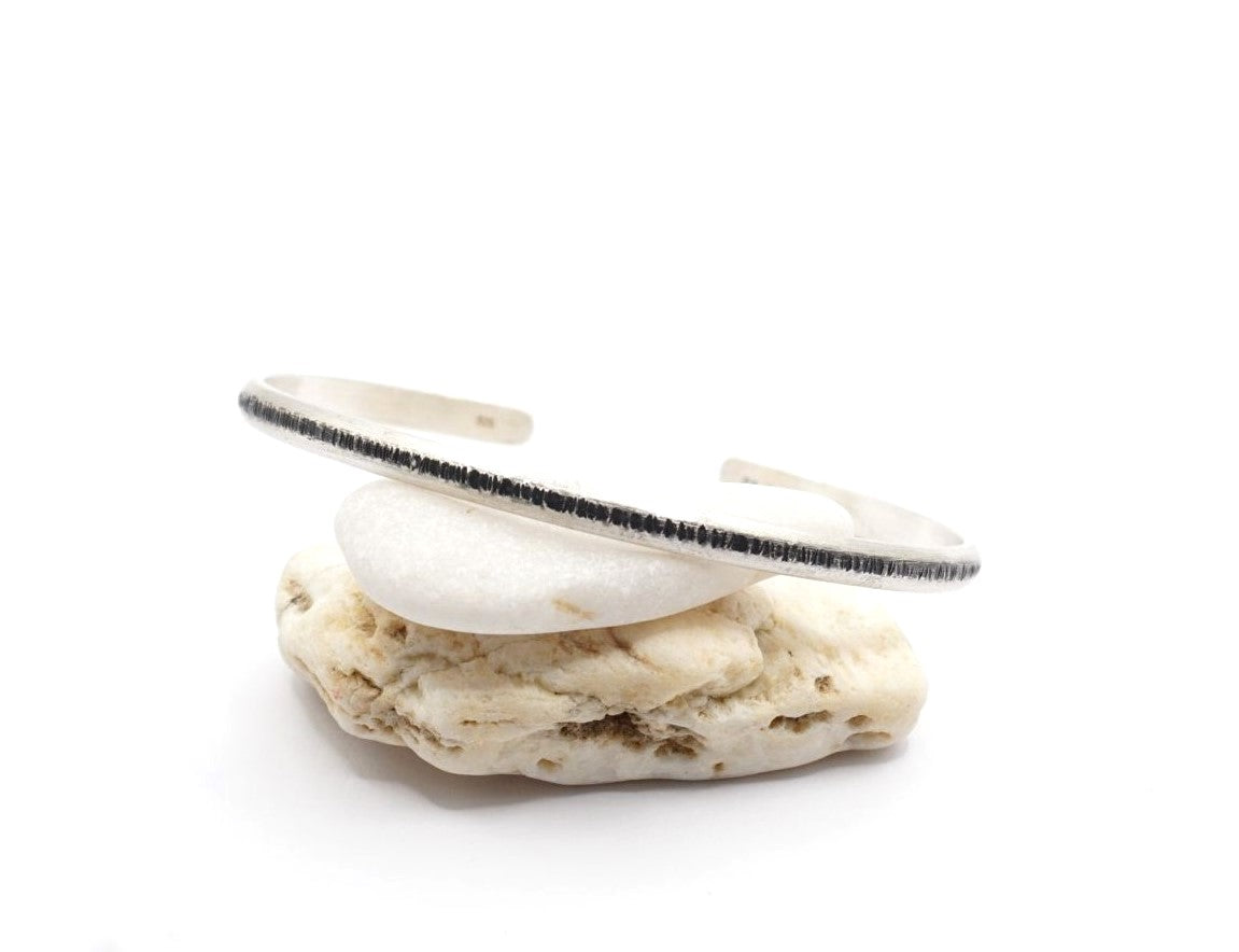 A minimalist sterling silver 925 C bracelet, hand-hammered and oxidized for an authentic industrial aesthetic.